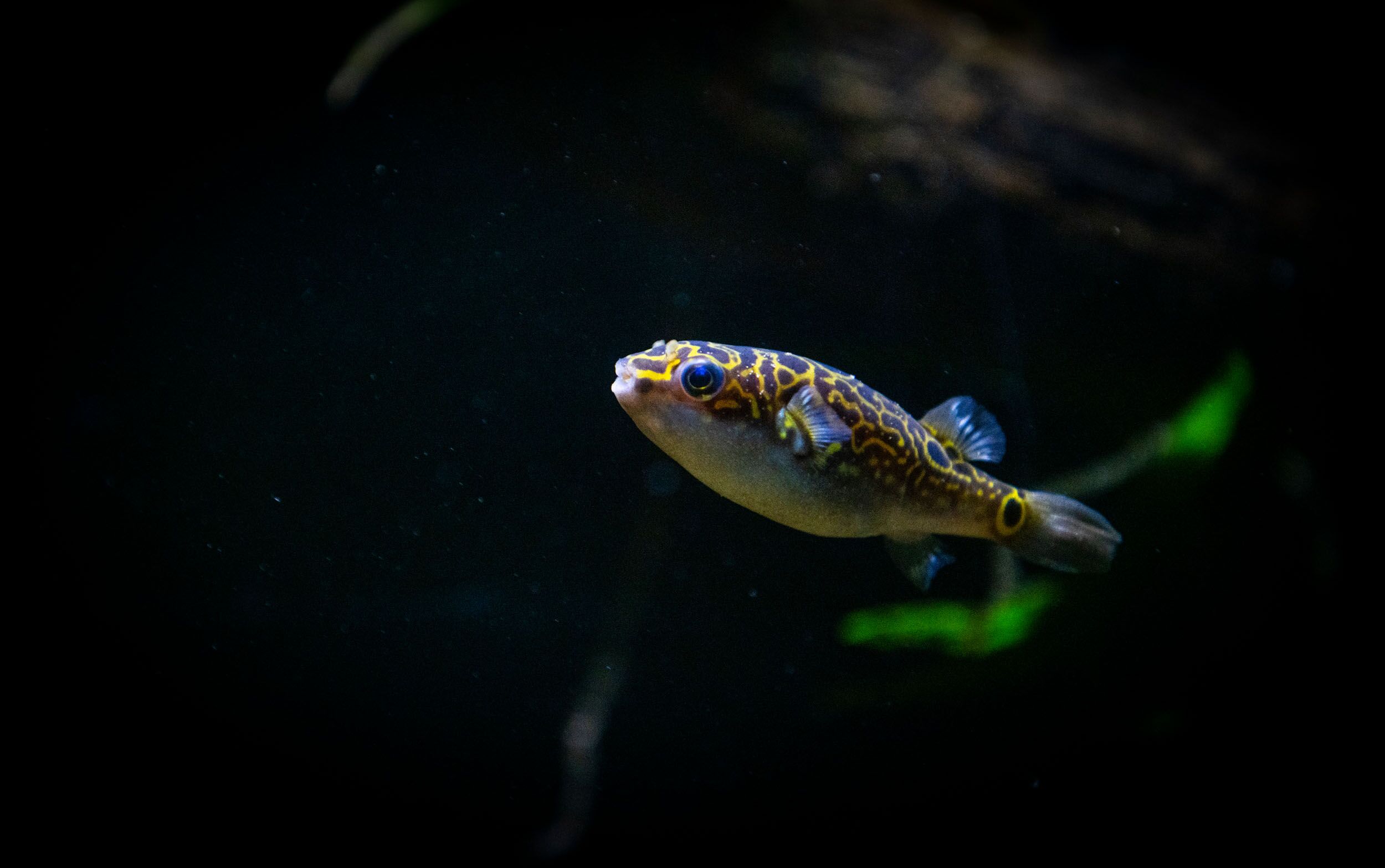 This pufferfish brings a lot of life to our brackish tanks as it speeds around the tank with it’s tiny fins and complex colourful pattern.