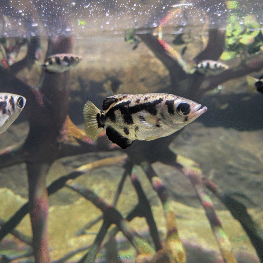 Banded archerfish (Toxotes jaculatrix), as their name suggests, are silver-coloured fish banded with darker patches across their bodies. They tend to live in brackish waters where saltwater meets freshwater, meaning that mangroves are their ideal habitats.