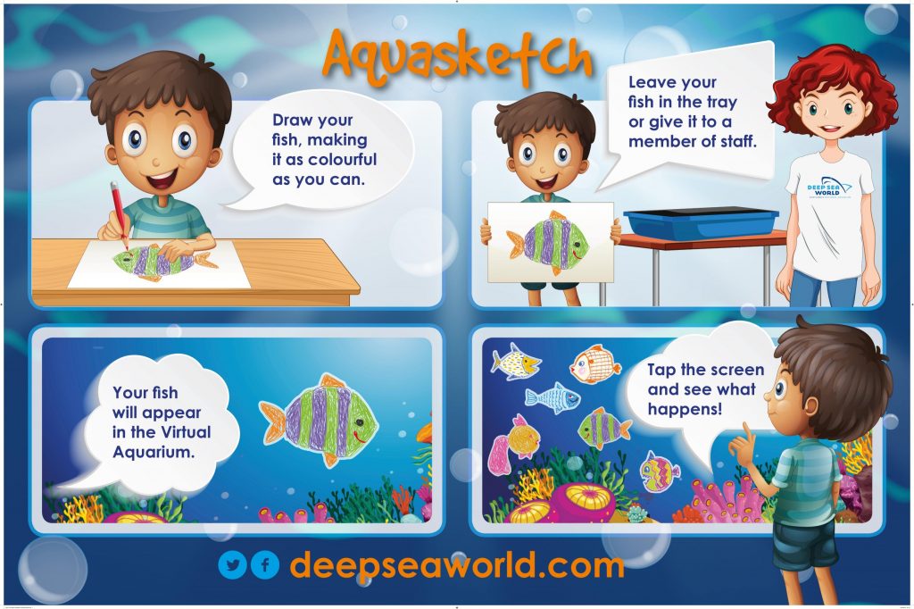 Aquasketch puts the power in your hands with over 25 different templates you can colour in a variety of different fish some of which can be found in the aquarium such as the foxface rabbitfish and bannerfish. Recreate your favourite fish or make your very own colourful creation.